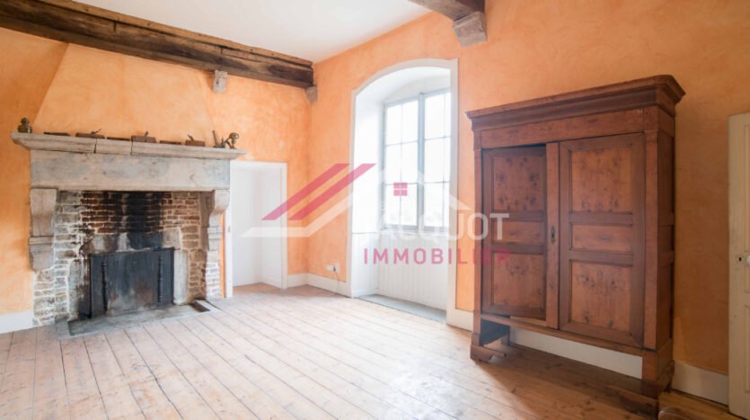 A l’étage : une belle pièce de vie avec sa cheminée monumentale (possibilité d’ouvrir une porte pour rejoindre le petit logement), salon avec sa cheminée de marbre rose, deux pièces, salle d’eau avec douche et toilette.